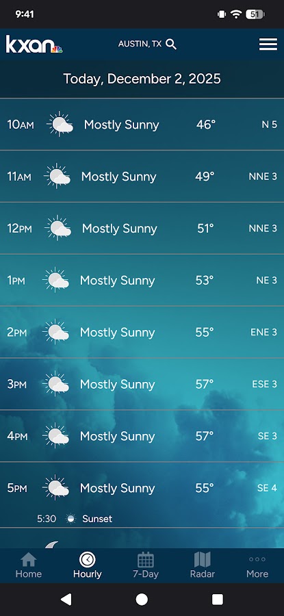Никогда не позволяйте погоде это вас не удивляет снова. Доверенные погода эксперты первое предупреждение Погода доставить Остин и центрального Техаса наиболее точную час за часом прогноз на следующий день и на неделю вперед. В отличие от других погодных приложений, вы получите местный прогноз, которая настроена для вас.
