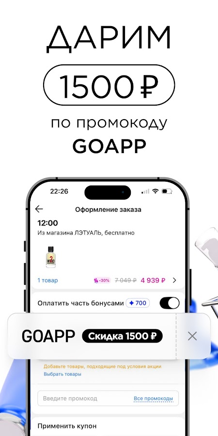 Получите дополнительную скидку 1500 руб по промокоду GOAPP при покупке от 4000 руб в мобильном приложении. Промокод действует до 31.12.2025 только для новых пользователей мобильного приложения. Правила использования промокода https://www.letu.ru/cc