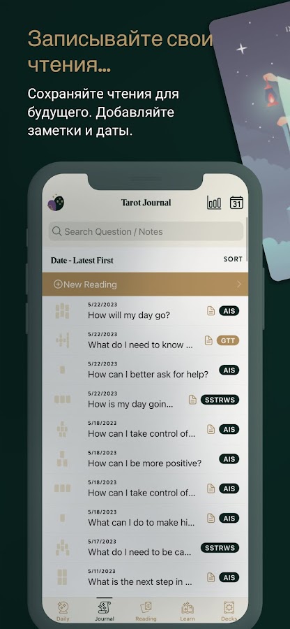 ✨ ПОЛУЧАЙТЕ ЧТЕНИЯ ТАРО ✨ Получайте показания на ходу или вводите физические показания Таро, чтобы запомнить ключевые моменты.