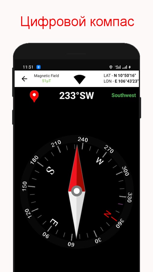 Цифровой компас с датчиком устройства, вы можете перемещать синхронизацию устройства с компасом карт. Чтобы использовать компас для Android, ваше устройство должно быть оборудовано магнитным датчиком для считывания магнитного поля Земли. Некоторые телефоны не поддерживают датчик компаса, поэтому он не может использовать компас.