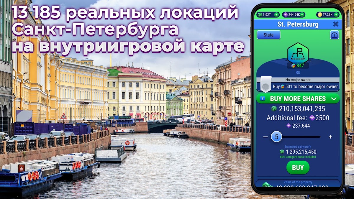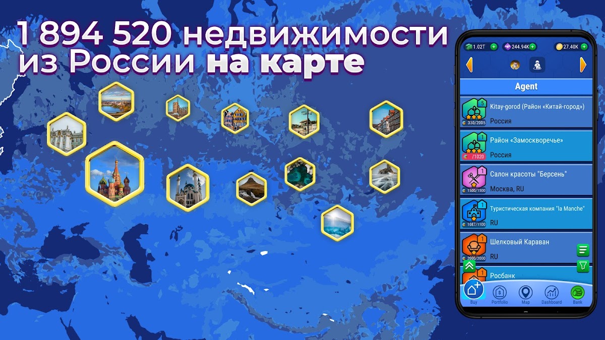 громные толпы людей. Поиск недвижимости займет у вас всего несколько мгновений, а ваша империя всегда будет под рукой на вашем телефоне. Развлечение не будет отвлекать вас от других дел — вы запускаете игру, покупаете, ведете переговоры, завершаете сделки. Вы всегда можете покупать столько долей недвижимости, насколько вам по карману.