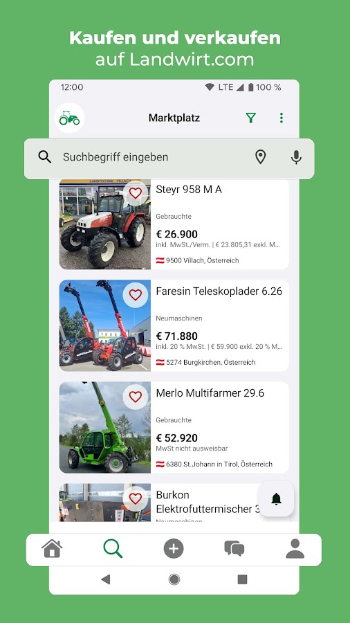 Трактор, навозоразбрасыватель или даже недвижимость — всего за несколько шагов вы можете легко создать объявление прямо с фермы. Многие категории постоянно бесплатны для частных продавцов. Покупатели и продавцы могут легко и безопасно общаться напрямую через приложение. Это позволяет быстро и легко найти подходящего покупателя.
