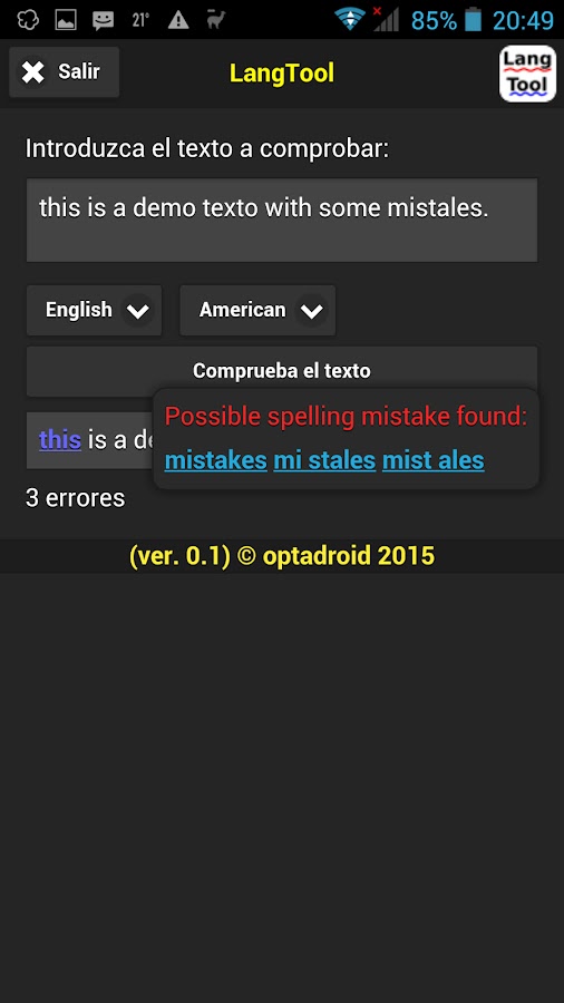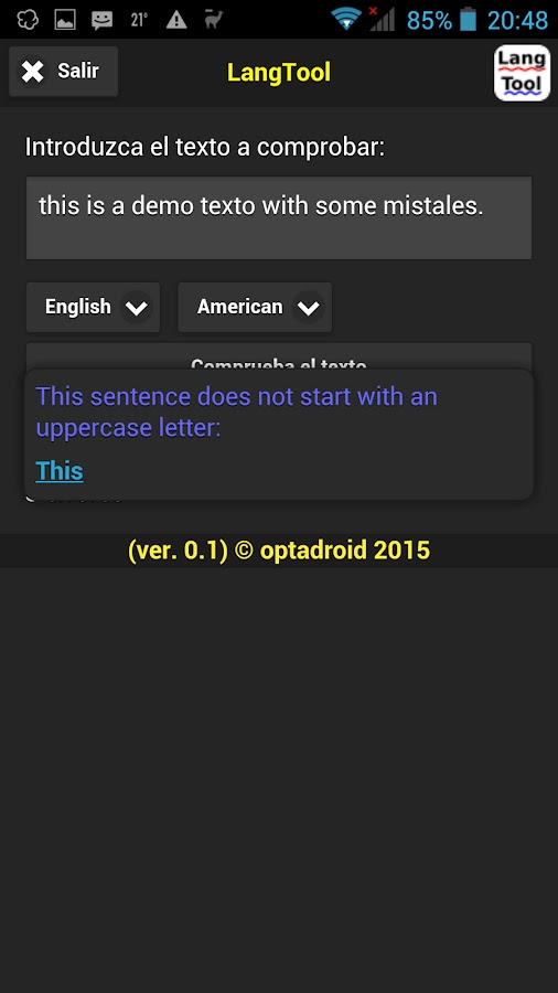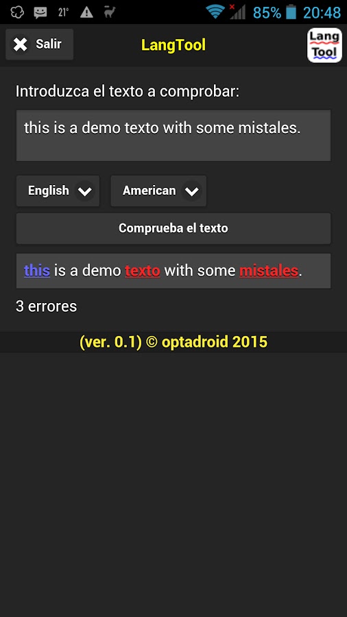 Выберите из более чем десяти различных языках, введите текст, чтобы проверить, и программа будет отправить его на сервер LanguageTool для проверки. Ошибочные слова или выражения выделены и коррекции предложения предоставляются.