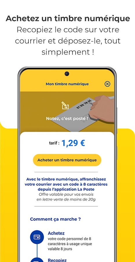 Приложение La Poste также является интернет-магазином, позволяющим приобретать наши почтовые решения с мобильного телефона: марки Marianne, конверты с марками и наклейки для отслеживания по отдельности, партиями или в буклетах.