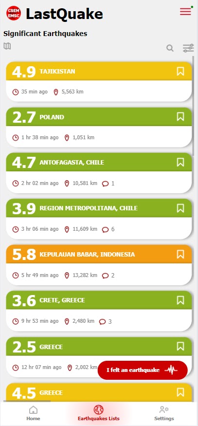 LastQuake — официальное приложение для планшетов и мобильных телефонов Европейского средиземноморского Сейсмологического Центра (EMSC-CSEM). LastQuake разработано сейсмологами и предназначено для оповещения населения и сбора свидетельств в режиме реального времени. С его помощью EMSC уже через несколько минут сможет оценить последствия землетрясения.