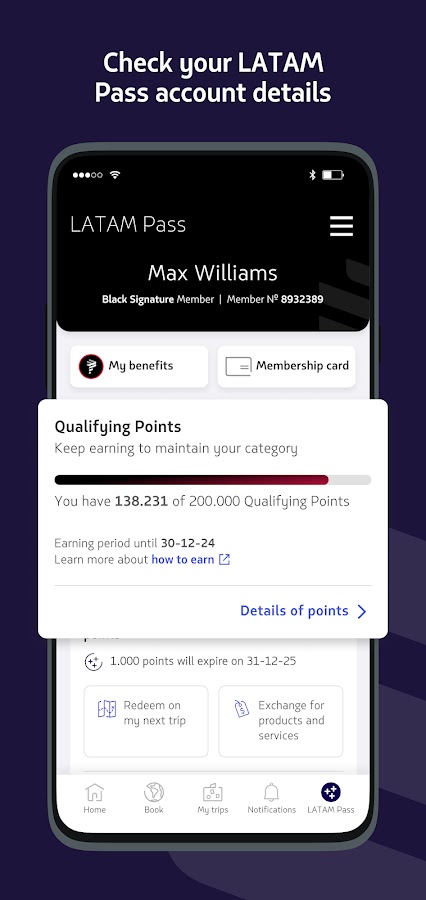 — Проверьте свои мили LATAM Pass, квалификационные баллы и преимущества категорий.