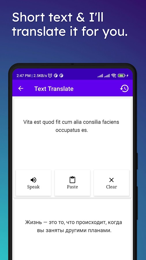 Латинско-русский переводчик для перевода текста, перевода слов, перевода абзацев, а также перевода полных предложений. Это приложение также используется для перевода с латыни на русский и перевода с русского на латынь, а также для слов, текста и полных предложений.