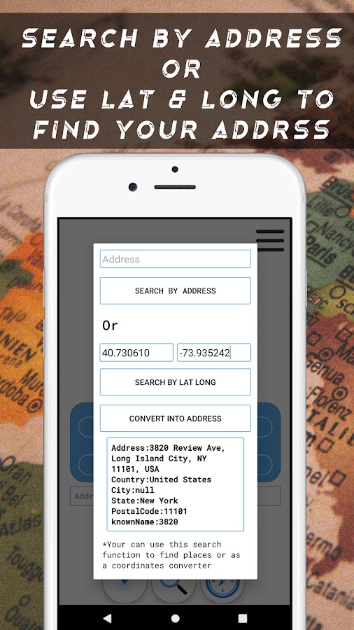 ✔ Вы можете искать местоположение по адресу или с помощью координатора GPS
