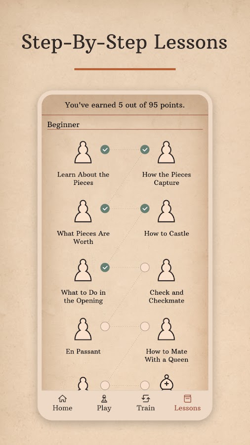 — **Комплексная программа обучения шахматам:** Занимайтесь с обширным набором из более чем 50 интерактивных шахматных уроков. Начиная с базовых концепций, вы перейдете к продвинутым стратегиям и тактикам, все структурировано для улучшения вашего понимания и производительности в шахматах.