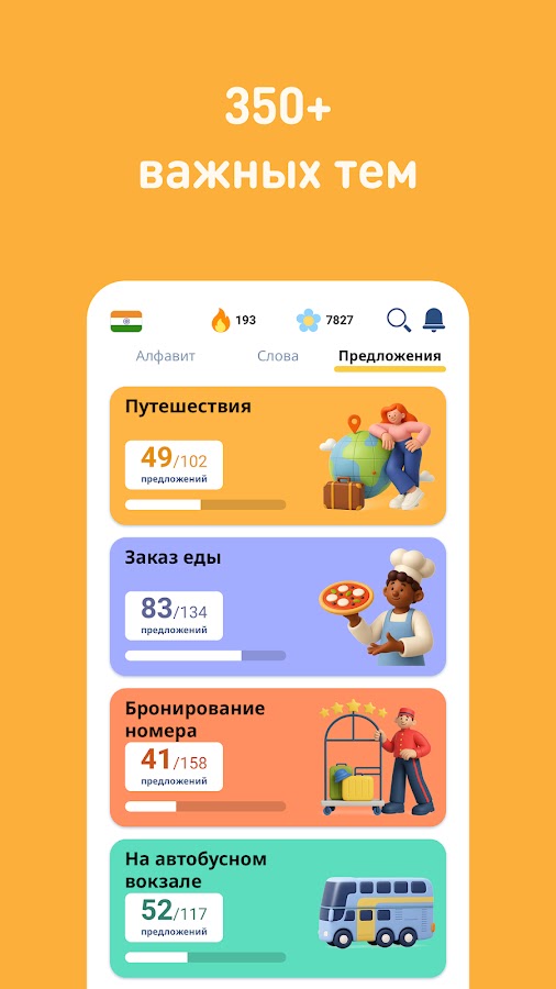 • 5.000 на хинди фраз (часто используемые): самые важные фразы для ежедневных разговоров и путешествий, поделенные на 10 уровней и 120 тем.