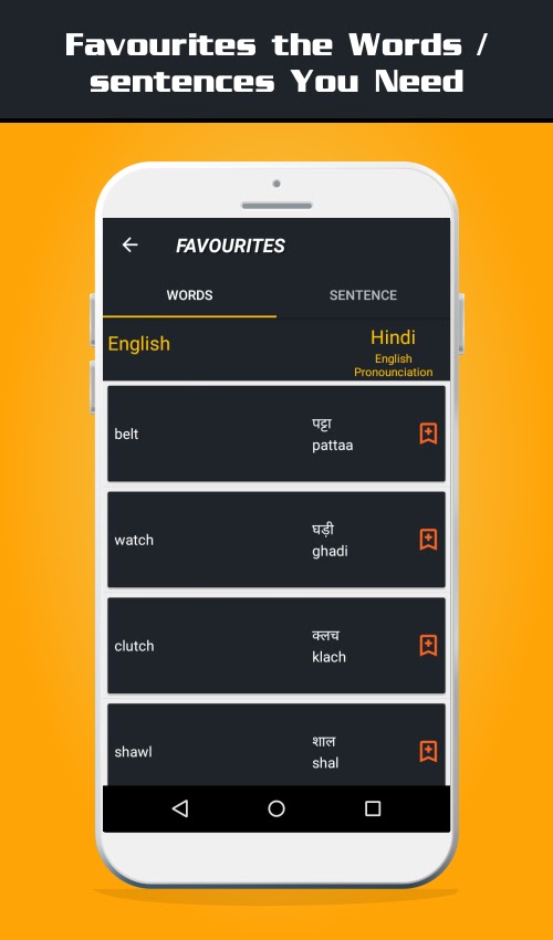 Вы можете добавить в избранное слова и предложения, которые вам нужно будет просмотреть позже, в этом приложении «Говорите на хинди».