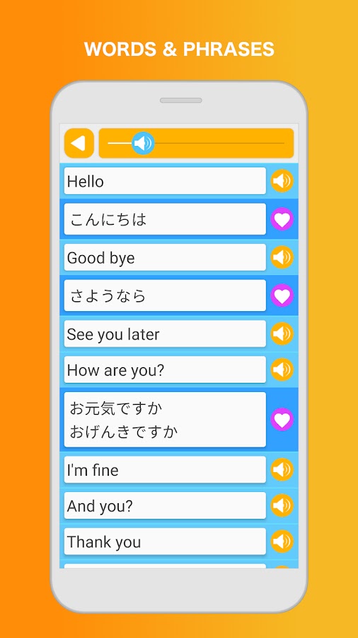С помощью этого приложения для изучения японского вы научитесь полезным фразам, охватывающим такие категории, как приветствия, общение, количество, хобби, проживание, прилагательные, животные, цвета, одежда, страны, направления, аварийные случаи, пища, языковые трудности, вопросы, фразы, предложения и прочие на японском.