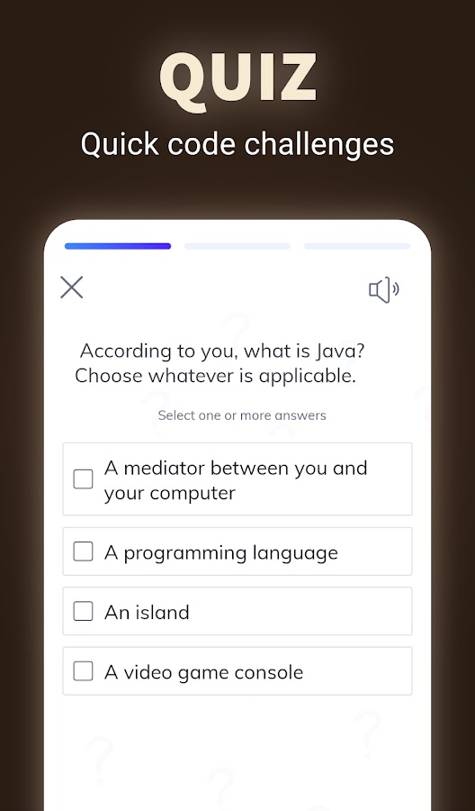Приложение «Learn Java Programming» имеет действительно простой и интуитивно понятный пользовательский интерфейс. Это лучшее приложение, которое позволит вам изучать язык программирования Java бесплатно. Так чего же ты ждешь? Загрузите приложение сейчас, чтобы стать экспертом по языкам программирования Java