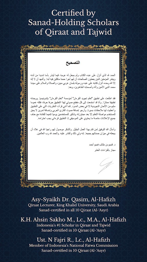 Прекрасный голос в Learn Quran Tajwid, принадлежит сертифицированному хафизу, отмеченному различными наградами за красивое чтение Корана. Приложение проверено и сертифицировано выдающимися учеными Корана, имеющими Санад (цепочку передачи). Мы ведь хотим, чтобы вы учились у экспертов!