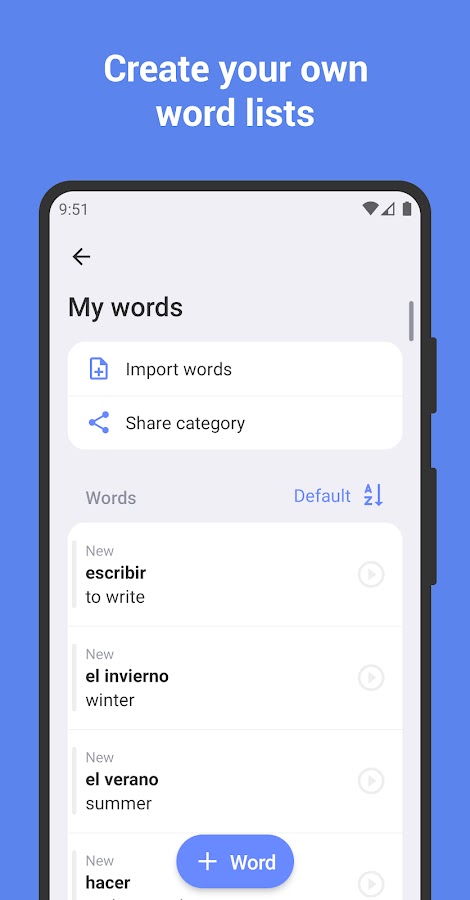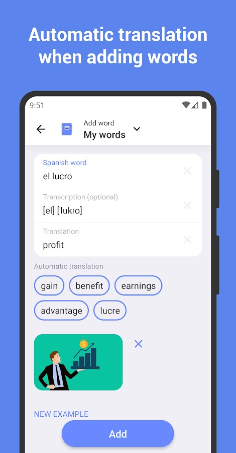 • Легко добавлять свои флеш карточки для запоминания слов: автоматически заполняются перевод, транскрипция, картинка и примеры.