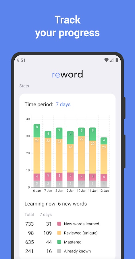 • Статистика обучения: отслеживайте запоминание слов за последнюю неделю, месяц, три месяца и год.
