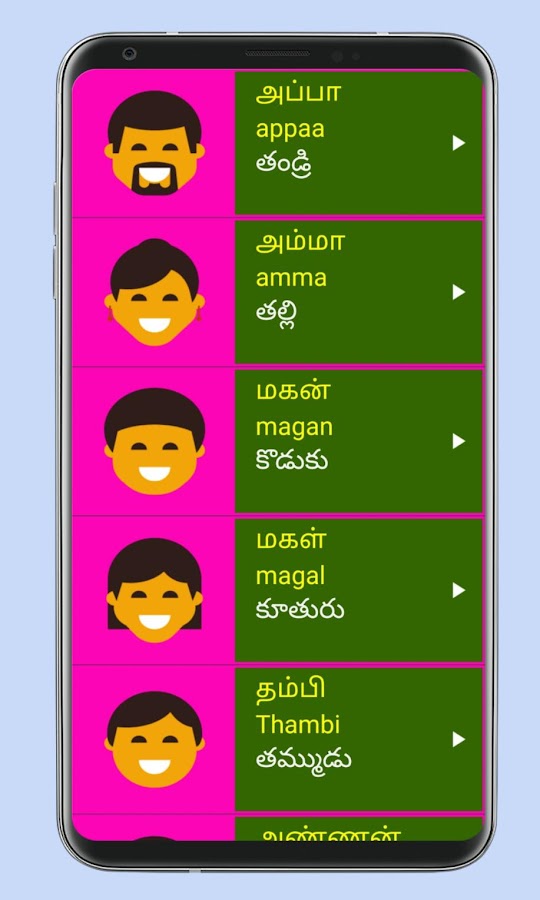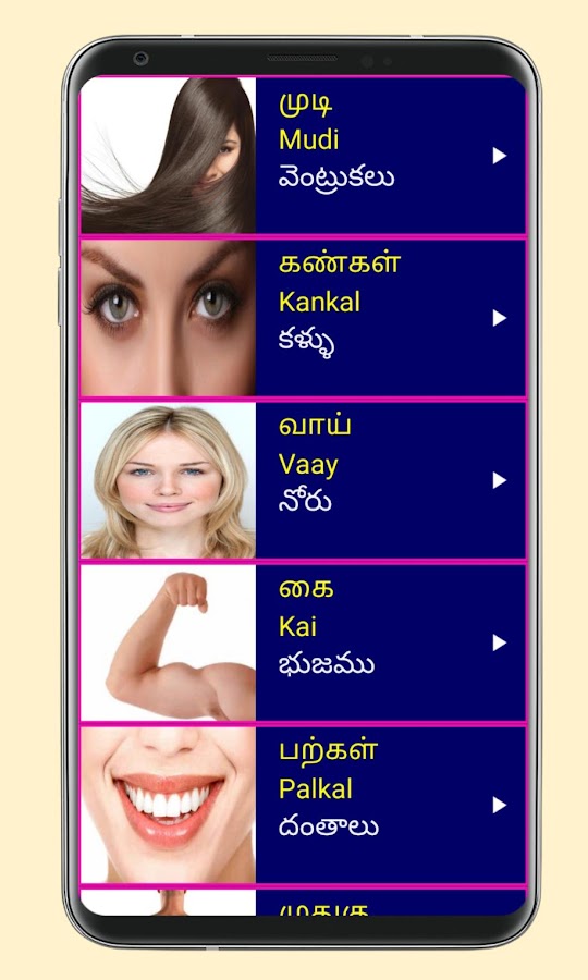 2. Каждое тамильское слово имеет четкое изображение 📸🖼️ и аудио произношение 🎵🔊, что упрощает изучение тамильского языка через телугу.