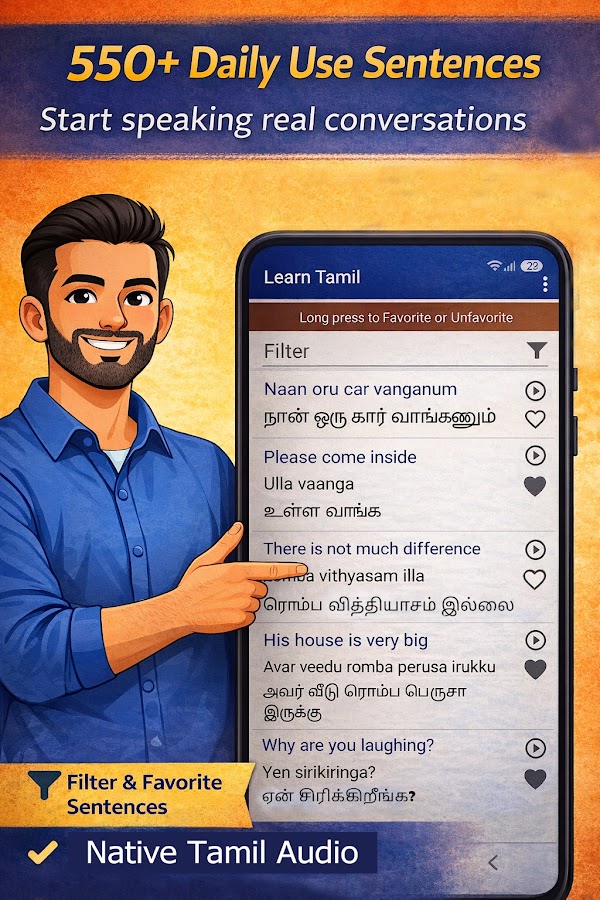 Это приложение — ваш идеальный путеводитель по изучению разговорного тамильского языка через английский — шаг за шагом, просто и практично!