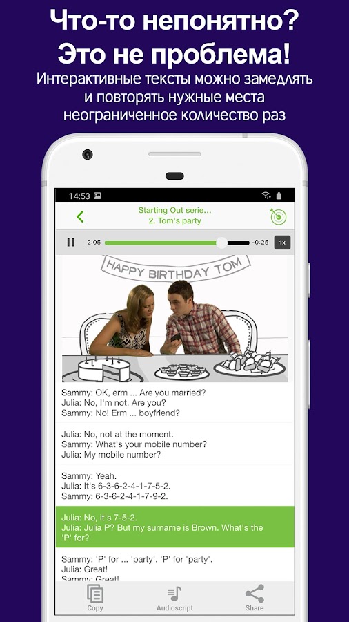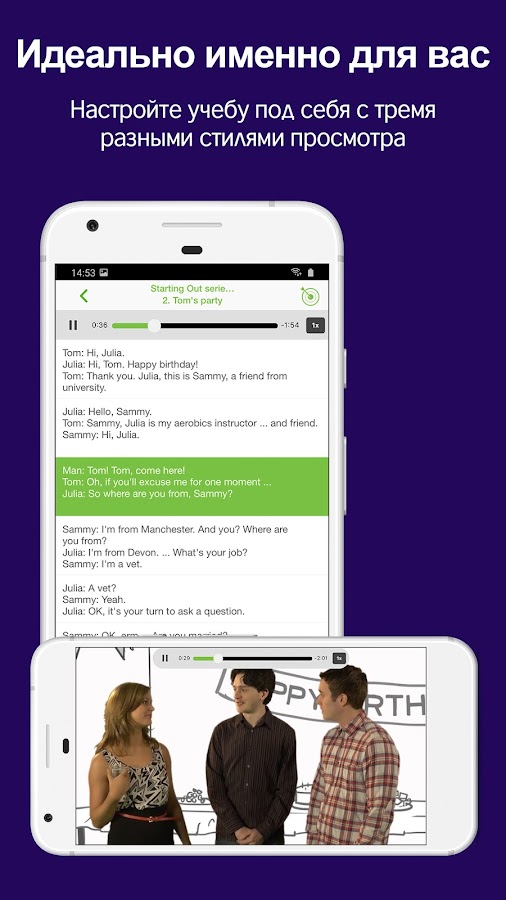 * Интерактивные тексты, с которыми можно повторять фразы или новые слова, если вы их не расслышали. Управление скоростью: замедлите видео, если говорящего сложно понять.
