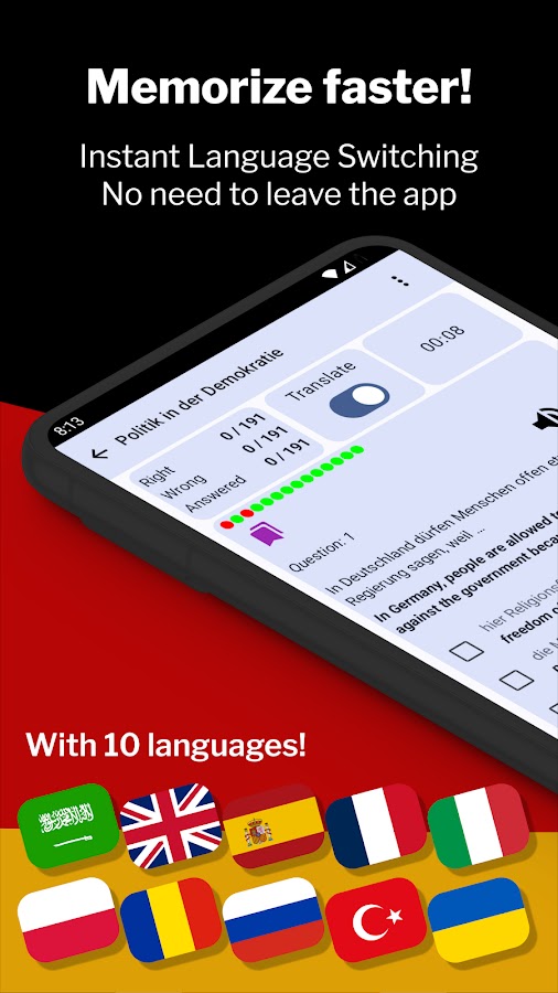 Подготовьтесь к тесту Leben In Deutschland – экзамену Einbürgerungstest – теперь с новой функцией Оффлайн встроенного перевода!