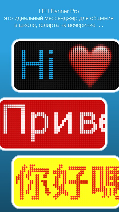 LED Banner Pro — это идеальный мессенджер для Android. Используйте его для общения с другими, когда не хотите привлекать внимание к себе, когда слова не помогают или вокруг слишком громко.