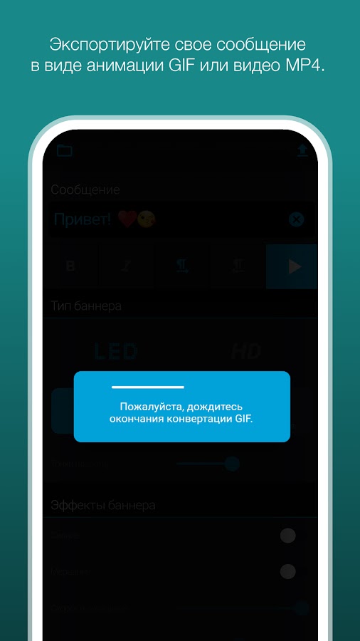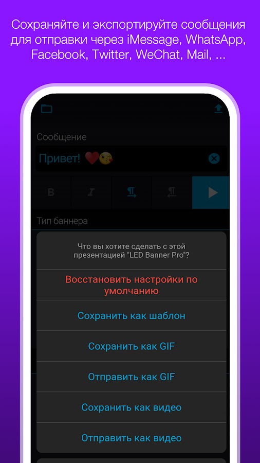 LED Banner Pro — единственное приложение для работы с баннерами, которое может сохранять и отправлять по почте созданные LED-баннеры в виде шаблонов и файлов в форматах MP4 и GIF.
