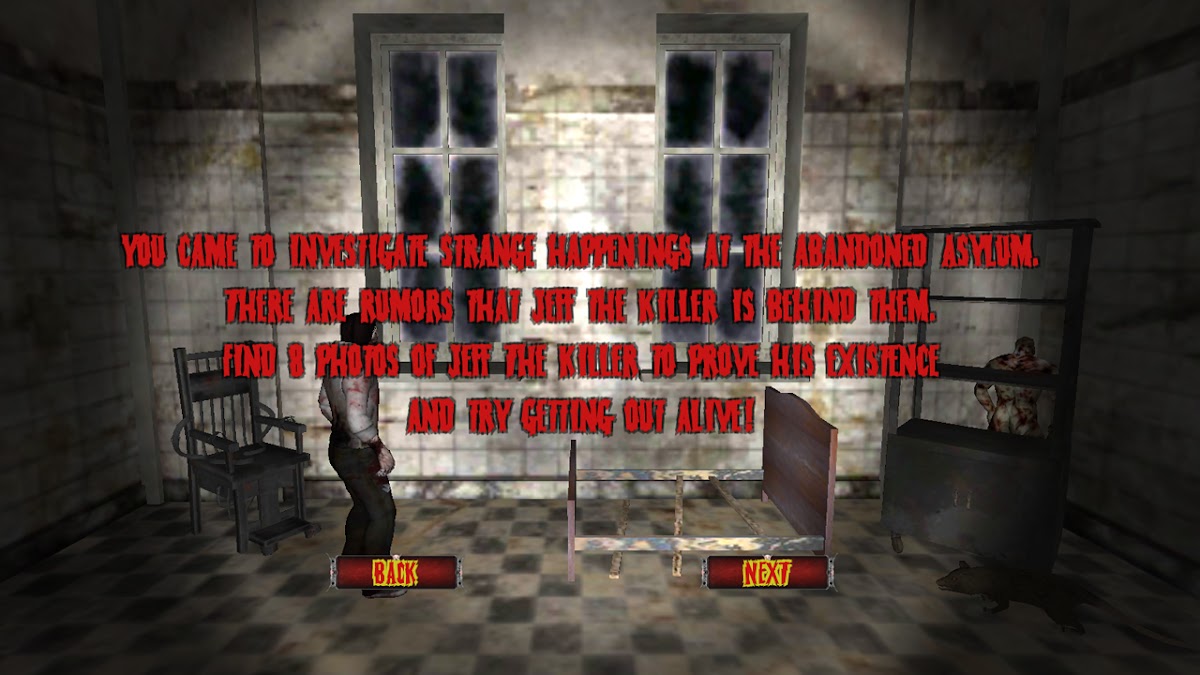 Вы пришли по расследованию странных событиях в заброшенном убежище. Есть слухи, что Джефф убийца за ними. Найти 8 фотографий Джефф Убийца доказать Его существование и попытаться выйти живым! Удачи!