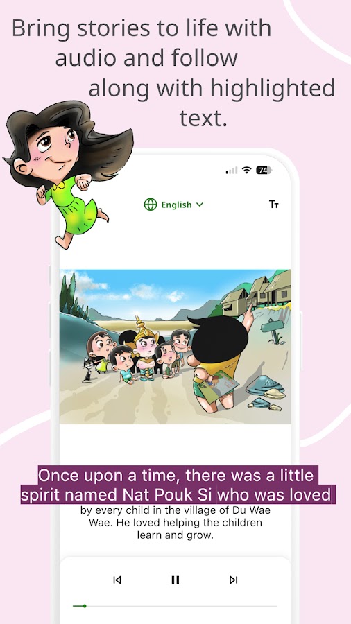 Многоязычные читатели могут переключаться между языками в сборниках рассказов одним касанием, получая доступ ко многим языкам, доступным в приложении Let’s Read, включая английский.