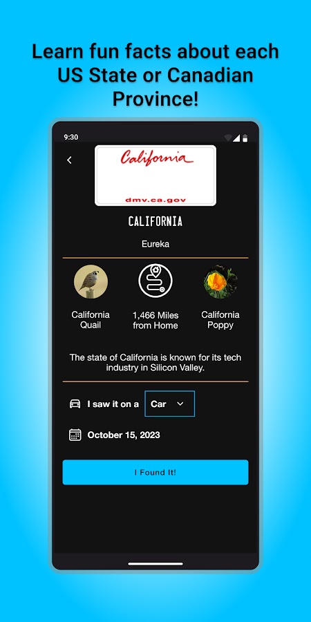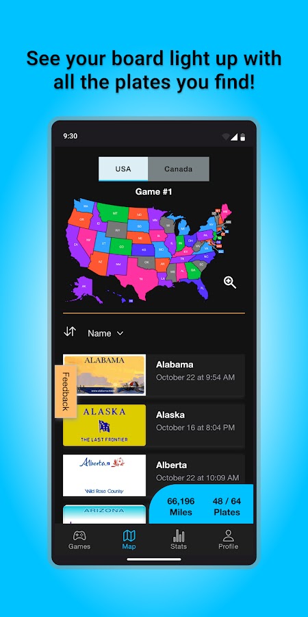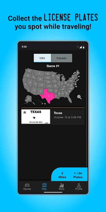 * Просматривайте обновленный счетчик и карту, когда вы замечаете каждый номерной знак штата на транспортных средствах, которые вы видите на дороге