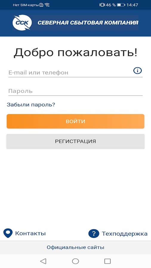 Если Вы зарегистрированы в Личном кабинете на сайте ООО «Северная сбытовая компания», для входа в приложение Вам достаточно использовать указанный Вами при регистрации номер телефона или e-mail и пароль.