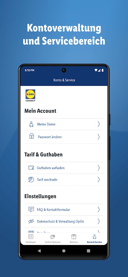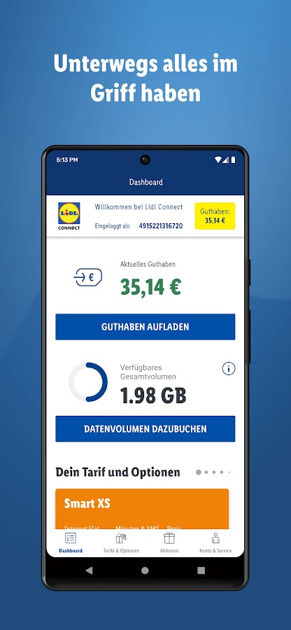 Клиенты ЛИДЛ Connect всегда можете восстановить свой кредит и заряд, когда это необходимо. Использование комфорт зарядки кредит будет даже автоматически взимается по запросу — что экономит время для более тонких вещей в жизни. Если вы говорите: «Моя тариф, и я, мы не подходят друг другу», вы можете настроить ваш план непосредственно из приложения или коммутатора.
