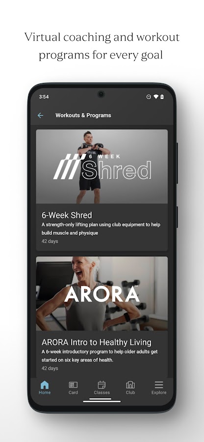 • Ознакомьтесь с программами тренировок, разработанными для таких целей, как снижение веса, силовые тренировки, активное долголетие и формирование здоровых привычек.