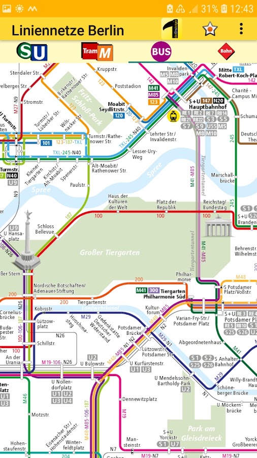 Все схемы и линии подходят для общественного транспорта в тарифной зоне ABC Берлина и для регионального транспорта Бранденбурга и Берлина (VBB). Приложение содержит информацию об общественном транспорте, то есть о сетях линий пригородного метро, метро, трамвая (MetroTram, Tram), регионального метро, автобуса (Metrobus, Nachtbus, XBus), паромов и аэропорт-экспресса (FEX).