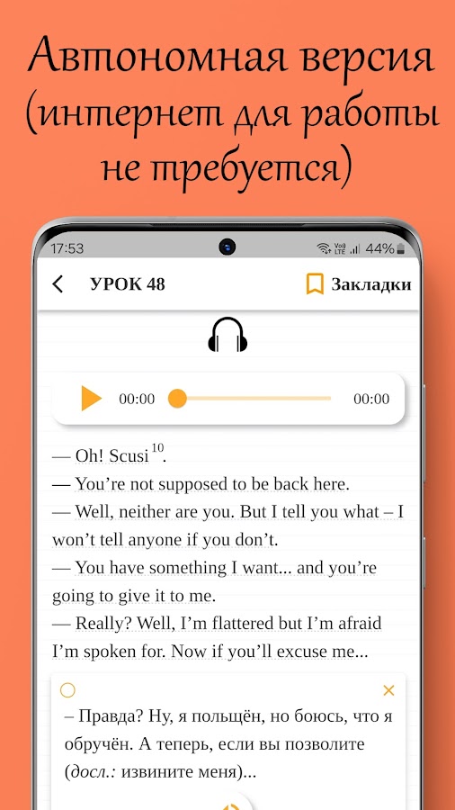 – Мини-плеер для прослушивания части диалога или отдельное предложение.
