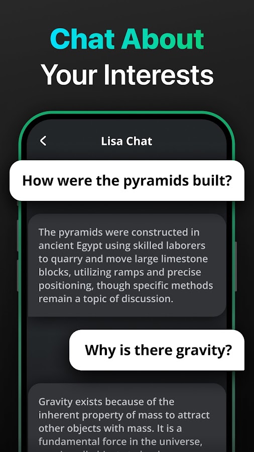 Обучение на Основе ИИ: С Lisa Chat вы можете изучать новые темы, расширять свои знания и участвовать в интеллектуальных дискуссиях, используя обширную библиотеку информации приложения и мощные идеи, основанные на ИИ.