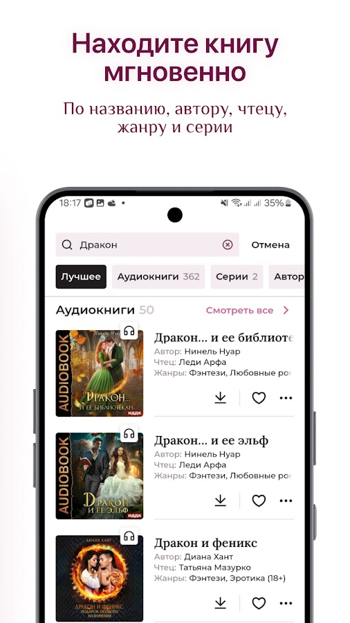 • Удобный поиск: по названию, автору, серии, жанру