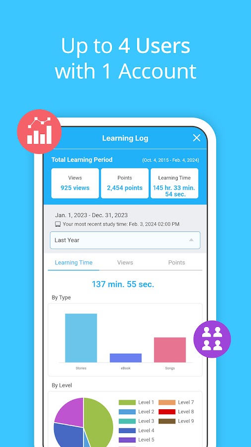 — Добавьте до трех детей! Одна учетная запись предназначена для четырех пользователей с индивидуальными данными обучения. (Только один пользователь может войти в систему одновременно.) Родительские пользователи могут отслеживать прогресс обучения дочерних пользователей.