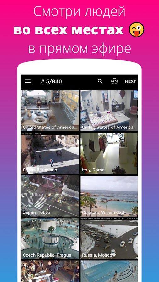 Live Camera это лучшее бесплатное приложение, чтобы смотреть живое видео с тысяч публичных веб камер наблюдения в твоем городе и по всему миру — Земля онлайн! Самая большая база данных видеокамер где можно вживую смотреть людей, животных, авто, города, погоду, события: живой видео стрим в реальном времени, сетевые камеры видеонаблюдения, охраны, безопасности. Просмотр, наблюдение знакомых и новых мест по всей планете Земля в онлайн, все направления для путешествия на IP камерах!