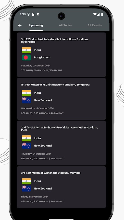 На этом экране обновляются данные о результатах всех последних и исторических матчей по крикету. Вы сможете проверить основные моменты каждого матча и счет для всех двусторонних серий, Кубка мира и IPL.
