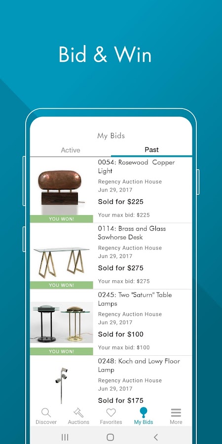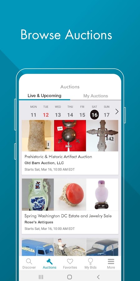 • Делайте ставки на аукционах от 5000+ аукционистов (это похоже на тысячи аукционных приложений в одном)