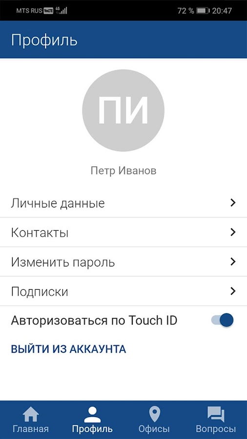 • Использовать Touch ID для входа в кабинет;