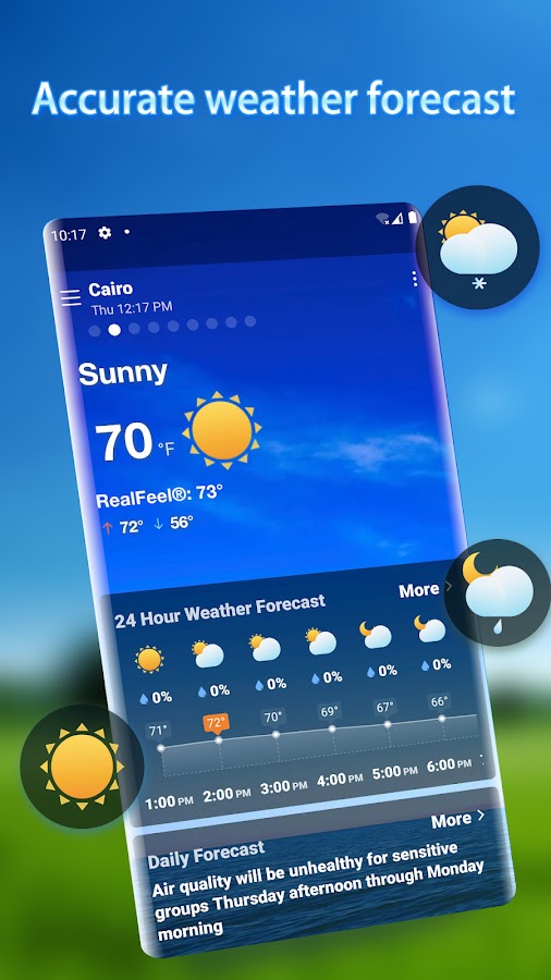 Вся информация о погоде собрана на одной странице для удобного просмотра. Просмотр и управление погодной информацией в нескольких городах одновременно. Вы можете предсказать погоду на ближайшие несколько часов и дней. Информация о погодных предупреждениях поможет вам спланировать заранее.