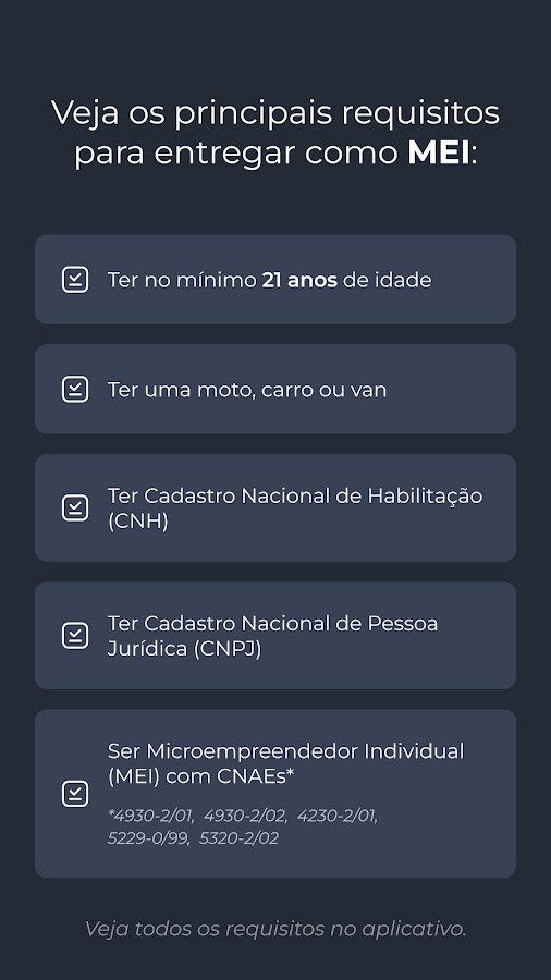 • Быть индивидуальным микропредпринимателем (MEI) с CNAE 4930-2/01, 4930-2/02, 4230-2/01, 5229-0/99, 5320-2/02.