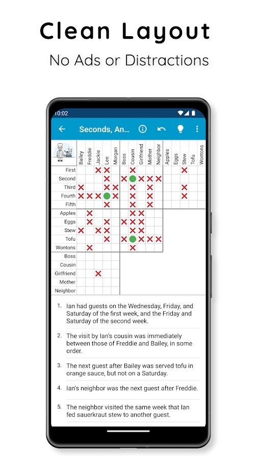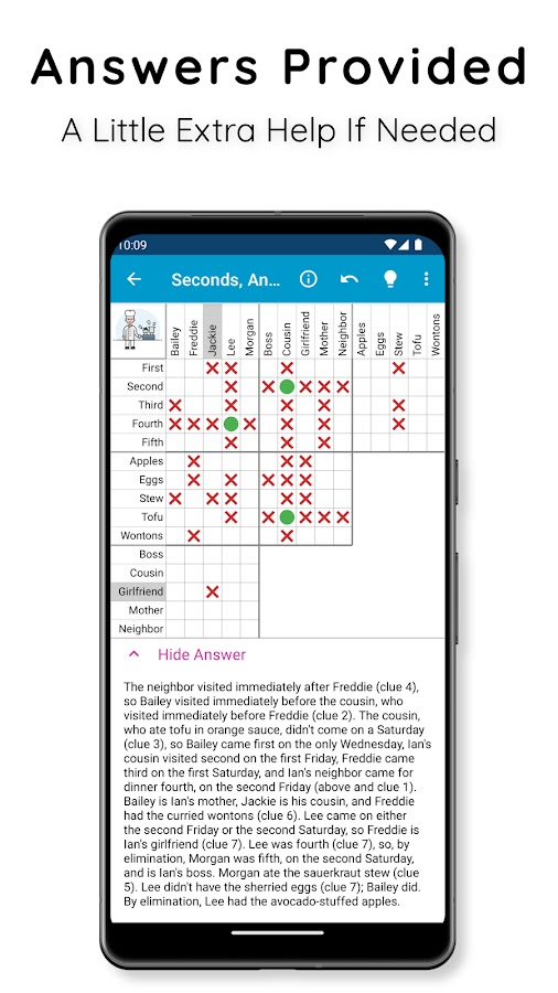 Больше никаких исправлений! Многоуровневая функция отмены и автоматическое исправление позволяют сосредоточиться на логике. Если вы застряли, исправьте ошибки, получите логическую подсказку или просмотрите полное решение, разработанное вручную — точно так же, как в журналах.