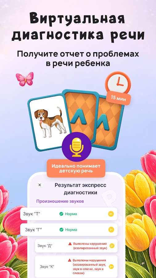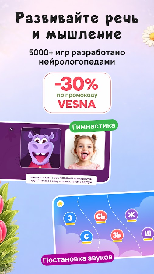 Приложение предлагает широкий спектр упражнений — от логопедических игр для детей от 3 лет и специальных дикция упражнения до логоритмических и нейрогимнастических упражнений и игр на артикуляцию. Ребенок играя 20 минут в день будет учиться говорить правильно.