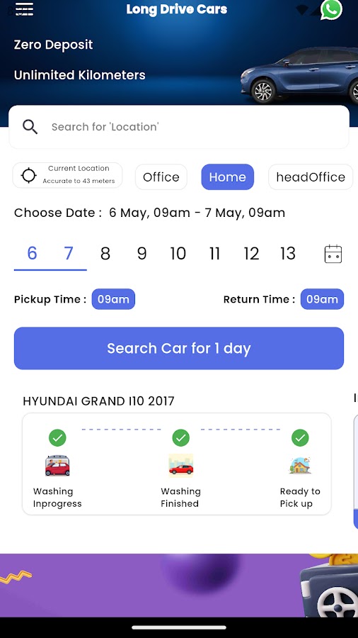 Забронировать автомобиль напрокат через Long Drive Cars очень просто. Просто установите наше приложение и выполните три простых шага: введите свой номер WhatsApp, выберите желаемую дату и время поездки и выберите автомобиль, который соответствует вашим требованиям, из нашего обширного ассортимента автомобилей. Вы можете изменить или продлить бронирование в зависимости от ваших потребностей.