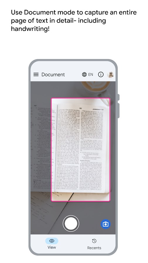 • Документы. В этом режиме приложение может детально распознать целую страницу текста, в том числе рукописного. Поддерживается более 30 языков.