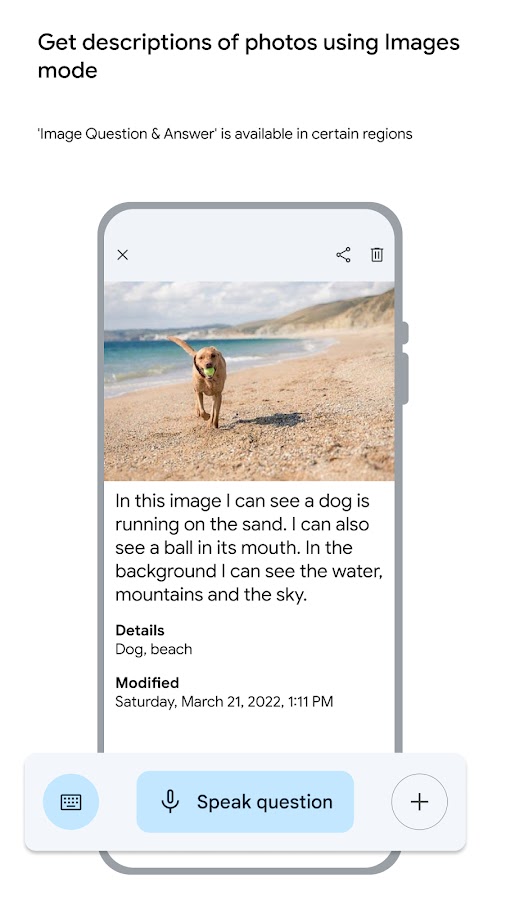 • Изображения. В этом режиме приложение описывает изображения и отвечает на вопросы о них. Описание изображений и ответы на вопросы доступны по всему миру, но только на английском языке.