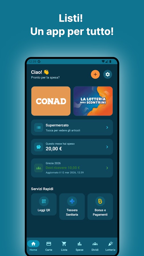 Listi! — это универсальное приложение для составления списков покупок, управления картами лояльности, планирования бюджета и групповых расходов. Организуйте совместные покупки в режиме реального времени, всегда носите с собой карты лояльности, отслеживайте свой ежемесячный бюджет и делите счет с друзьями и соседями по квартире. Бесплатно, быстро и разработано для Италии.