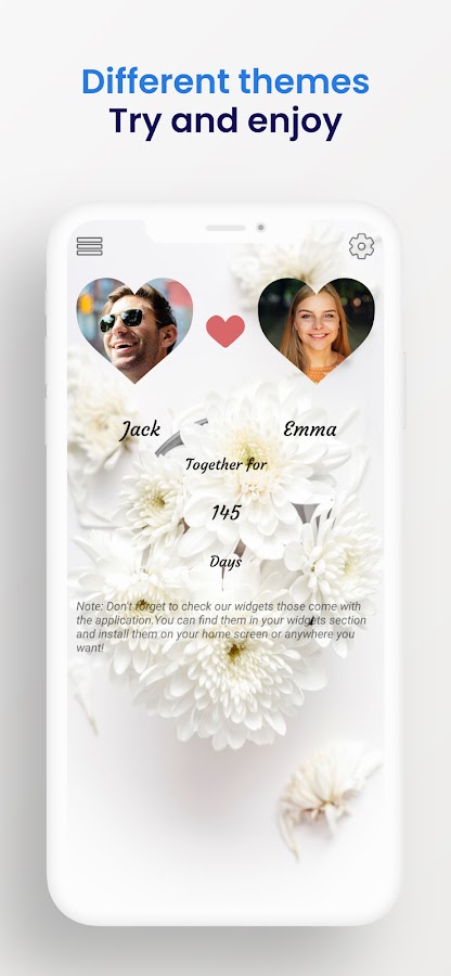 См дней прошло дней, ваш и фотографии вашего любовника и имена с помощью виджетов и уведомления, не открывая приложение с помощью счетчика. Сообщите себе каждый месяц ваших отношений Если вы want.Customize тема и фон для free.Show вашего статуса любовь ко всем.